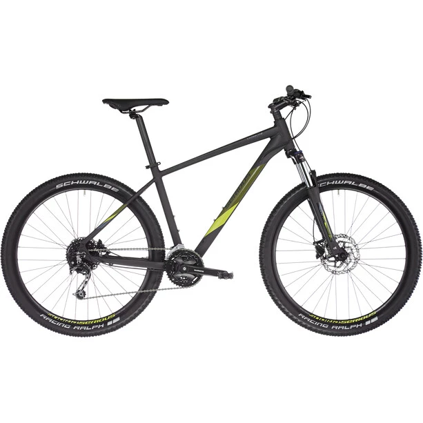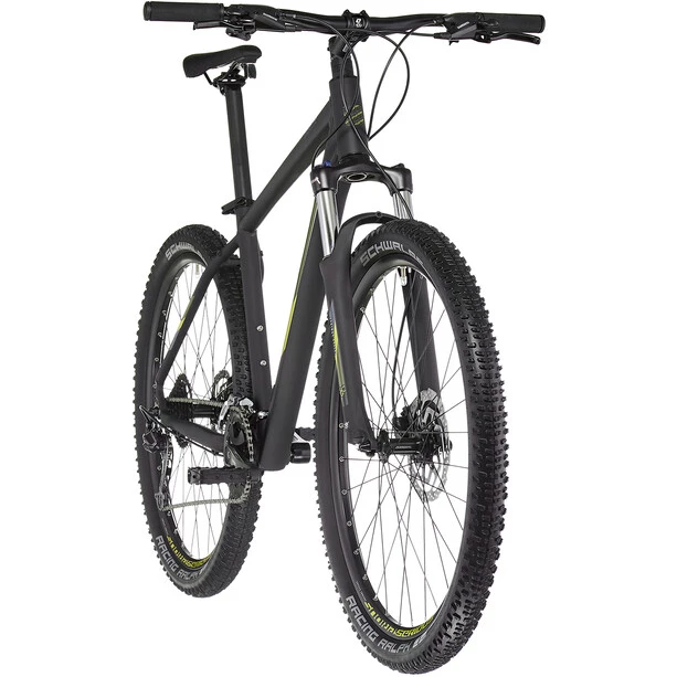 Doté d’une fourche Suntour avec un débattement de 100 mm qui vous fera oublier tous les petits défauts de la route, le Shoreline assure confort et contrôle sur les sentiers non asphaltés et les pistes étroites. Le cadre et la fourche sont portés par des roues robustes de 27,5 pouces, dotées de larges pneus Schwalbe Racing Ralph. Ce format intermédiaire, très populaire auprès des vététistes, combine les avantages des roues de 26 pouces très maniables avec les excellentes caractéristiques de roulement des roues 29 pouces. Ses freins à disques hydrauliques Shimano garantissent un freinage performant par tous les temps, indispensable lors de randonnées en VTT. Vous gardez ainsi le contrôle, même dans les longues descentes ou pendant un freinage d’urgence ! Mais le pilote du Shoreline peut aussi envisager le sourire aux lèvres les montées raides et les passages où le pédalage rapide s’impose. Car le VTT Serious Shoreline est également équipé d’une transmission à 27 vitesses pour une large gamme de rapports qui offre une conduite clairement orientée sport.